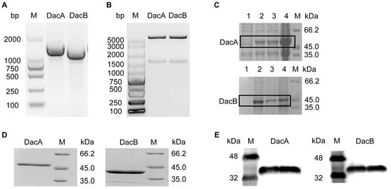 On the whole, the DacA gene was 1239 bp in length, encoding 412 amino acids, of which its theoretical molecular weight was 45.3 kDa, while the DacB gene was 1068 bp in length, encoding 355 amino acids, and its theoretical molecular weight was 40.1 kDa. The expressed DacA/DacB protein had a histidine tag (6 × His) at the C-terminus. Therefore, the molecular weight displayed on the protein gel chart is slightly larger than that of the prediction.