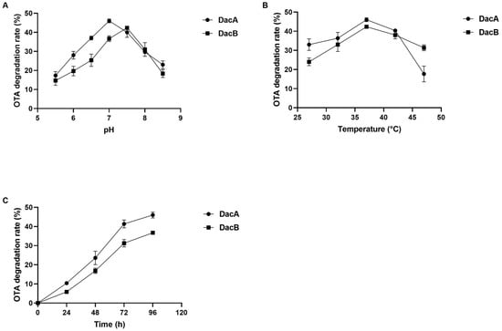 Detoxification characteristics of OTA by DacA and DacB: (A) the optimum pH of DacA and DacB; (B) the optimum temperature of DacA and DacB; (C) the degradation time of OTA by DacA and DacB.