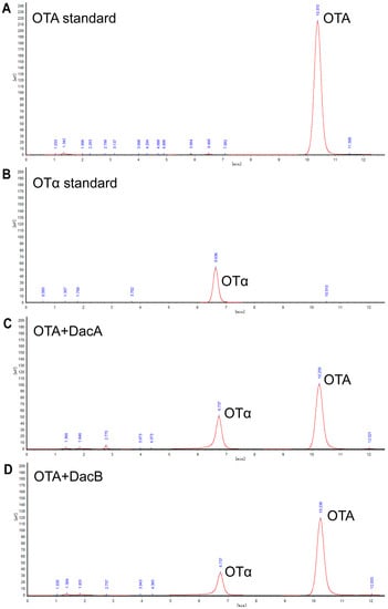 Determination of OTA and OTα by HPLC: (A) OTA standard; (B) OTα standard; (C) OTA standard processed by DacA; and (D) OTA standard processed by DacB.
