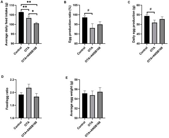 Production performances of layers during the study (n = 15, mean ± SEM). (A) Effects of OTA and ANSB168 on layers’ average daily feed intake (g). (B) Effects of OTA and ANSB168 on layers’ egg production ratio (%). (C) Effects of OTA and ANSB168 on layers’ daily egg production (g). (D) Effects of OTA and ANSB168 on layers’ feed/egg ratio. (E) Effects of OTA and ANSB168 on layers’ average egg weight (g). Data were analyzed with ANOVA and Tukey’s HSD and significant differences were defined as # 0.05 ≤ p < 0.10, * p < 0.05, and ** p < 0.01.