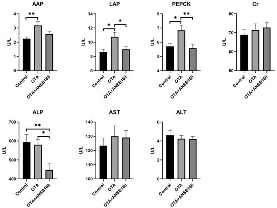 Effects of OTA and ANSB168 on serum biochemical parameters of layers after 28 days (n = 15, mean ± SEM), including AAP, LAP, PEPCK, Cr, ALP, AST, and ALT. Data were analyzed with ANOVA and Tukey’s HSD and significant differences were defined as * p < 0.05, and ** p < 0.01.
