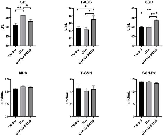 Effects of OTA and ANSB168 on oxidative stress and antioxidant status of layers after 28 days (n = 15, mean ± SEM), including GR, T-AOC, SOD, MDA, T-GSH, and GSH-Px. Data were analyzed with ANOVA and Tukey’s HSD and significant differences were defined as * p < 0.05, and ** p < 0.01.