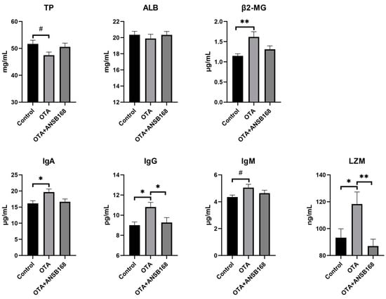 Effects of OTA and ANSB168 on immune response of layers after 28 days (n = 15, mean ± SEM), including serum immunoglobulin (TP, ALB, β2-MG, IgA, IgG, IgM) and LZM. Data were analyzed with ANOVA and Tukey’s HSD and significant differences were defined as # 0.05 ≤ p < 0.1, * p < 0.05, and ** p < 0.01.