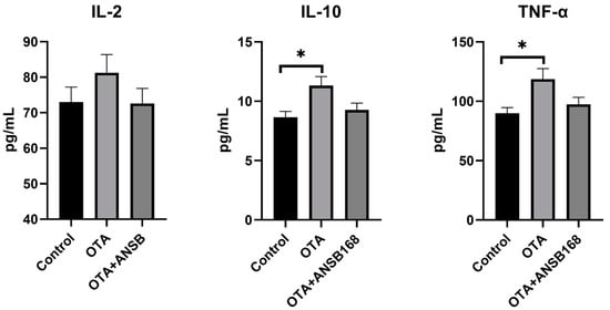 Effects of OTA and ANSB168 on serum cytokines (IL-2, IL-10, and TNF-α) of layers after 28 days (n = 15, mean ± SEM). Data were analyzed with ANOVA and Tukey’s HSD and significant differences were defined as * p < 0.05.