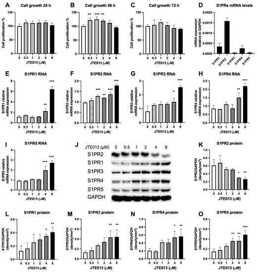 Effects of JTE013 on cell growth and S1PRs expressions. Murine BMSCs were cultured in osteogenic media for 1 to 3 days with the presence of either DMSO or JTE013 (0.5 to 8 μM). Cell growth at (A) 24 h, (B) 48 h, and (C) 72 h was quantified by a CellTiter 96® AQueous One Solution Cell Proliferation Assay. (D) Relative S1PRs’ mRNA levels in murine BMSCs cultured in DMEM media with 10% FBS and 100 U/mL penicillin and streptomycin. (E–I) Murine BMSCs were treated with either DMSO or JTE013 (0.5 to 8 μM) and cultured in osteogenic media for 7 days. (E) S1PR1, (F) S1PR2, (G) S1PR3, (H) S1PR4, and (I) S1PR5 mRNA levels were quantified by RT-qPCR and normalized by GAPDH expression. (n = 3, * p < 0.05, ** p < 0.01, *** p < 0.001). (J–O) Murine BMSCs were treated with either DMSO or JTE013 (0.5 to 8 μM) and cultured in osteogenic media for 9 days. (J) S1PR2, S1PR1, S1PR3, S1PR4, S1PR5, and GAPDH protein levels were measured by Western blot. Protein densitometry of (K) S1PR2, (L) S1PR1, (M) S1PR3, (N) S1PR4, and (O) S1PR5 was normalized by GAPDH protein expression in BMSCs (n = 3, * p < 0.05, ** p < 0.01, *** p < 0.001).