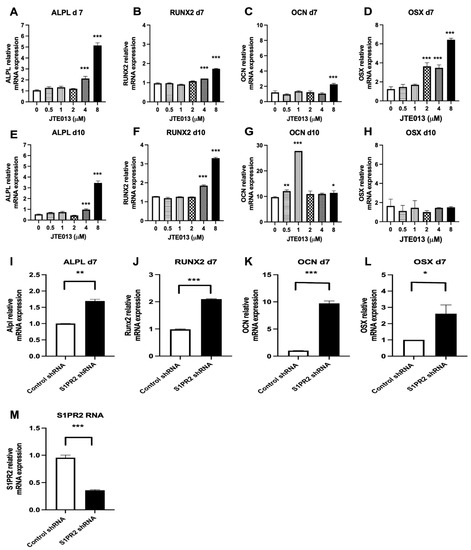 Treatment with the S1PR2 antagonist (JTE013) or a S1PR2 shRNA increased osteogenic gene (ALPL, RUNX2, OCN, and OSX) expressions in murine BMSCs. Murine BMSCs were cultured in osteogenic media with either vehicle (DMSO) or JTE013 (0.5 to 8 μM) for 7 or 10 days, or were cultured in osteogenic media with a control shRNA or a S1PR2 shRNA for 7 days. (A,E) ALPL, (B,F) RUNX2, (C,G) OCN, and (D,H) OSX mRNA levels in murine BMSCs treated with either DMSO or various doses of JTE013 on day 7 or day 10 were quantified by RT-qPCR and normalized by GAPDH expression. (I) ALPL, (J) RUNX2, (K) OCN, (L) OSX, and (M) S1PR2 mRNA levels in murine BMSCs treated with either a control shRNA or a S1PR2 shRNA on day 7 were quantified by RT-qPCR and normalized by GAPDH expression. (n = 3, * p < 0.05, ** p < 0.01, *** p < 0.001).