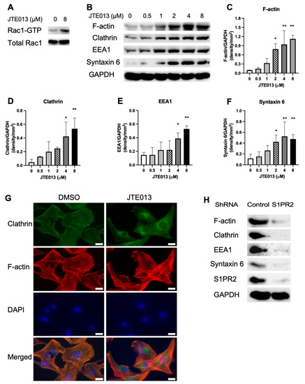 JTE013 was previously shown to increased bacterial endocytosis and phagocytosis [19]. We hypothesized that treatment with JTE013 could enhance Rac1-GTP, which subsequently could promote actin polymerization and vesicle trafficking. As shown in Figure 5A, treatment with JTE013 (8 μM) enhanced Rac1-GTP compared with DMSO treatment in BMSCs. Treatment with JTE013 (2 to 8 μM) significantly enhanced F-actin (Figure 5B,C) and syntaxin 6 (Figure 5B,F) in BMSCs cultured with osteogenic media compared with DMSO treatment (* p < 0.05, ** p < 0.01). Treatment with JTE013 (4 to 8 μM) also significantly increased clathrin heavy chain (Figure 5B,D) and EEA1 expressions (Figure 5B,E) compared with DMSO treatment (* p < 0.05, ** p < 0.01). Immunofluoresence staining of clathrin shows that JTE013 (8 μM) induced the expression of clathrin-coated vesicles in the cytoplasm 30 min after changing with osteogenic media compared with BMSCs treated with DMSO and cultured in osteogenic media (Figure 5G). These data suggest that treatment with JTE013 increased vesicle trafficking in murine BMSCs cultured in osteogenic media. However, we observed a reduction of expressions of F-actin, clathrin, EEA1, and syntaxin 6 in murine BMSCs treated with the S1PR2 shRNA compared with murine BMSCs treated with the control shRNA (Figure 5H), which suggests that the S1PR2 shRNA inhibited vesicle trafficking in murine BMSCs cultured in osteogenic media compared with the control shRNA treatment. The S1PR2 shRNA reduced S1PR2 protein expression in murine BMSCs (Figure 5H).