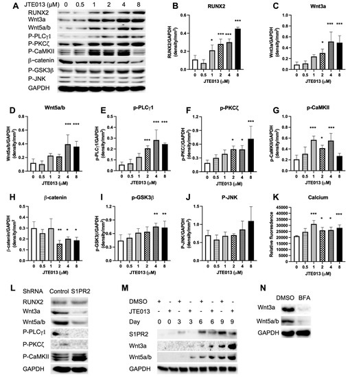 JTE013, but not a S1PR2 shRNA, increased RUNX2 and Wnt/Ca2+ signaling in murine BMSCs cultured in osteogenic media. (A) RUNX2, Wnt3a, Wnt5a/b, p-PLCγ1, p-PKCζ, p-CaMKII, β-catenin, p-GSK3β, p-JNK, and GAPDH protein expressions in murine BMSCs cultured in osteogenic media with either DMSO or JTE013 (0.5 to 8 μM) for 9 days. Proteins were harvested 30 min after changing osteogenic media with or without JTE013. Protein densitometry of (B) RUNX2, (C) Wnt3a, (D) Wnt5a/b, (E) p-PLCγ1, (F) p-PKCζ, (G) p-CaMKII, (H) β-catenin, (I) p-GSK3β, and (J) p-JNK was normalized by GAPDH protein expression in murine BMSCs (n = 3, * p < 0.05, ** p < 0.01, *** p < 0.001). (K) Ca2+ level in murine BMSCs treated with DMSO or JTE013 and cultured with osteogenic media for 9 days (n = 5, * p < 0.05, *** p < 0.001). (L) RUNX2, Wnt3a, Wnt5a/b, p-PLCγ1, p-PKCζ, p-CaMKII, and GAPDH protein expressions in BMSCs treated with a control shRNA or a S1PR2 shRNA and cultured in osteogenic media for 9 days. (M) S1PR2, Wnt3a, Wnt5a/b, and GAPDH protein expressions in murine BMSCs treated with DMSO or JTE013 (8 μM) from 30 min to 9 days. (N) Wnt3a, Wnt 5a/b, and GAPDH protein expressions in BMSCs treated with DMSO or brefeldin A (BFA, 0.75 μM) and cultured in osteogenic media for 6 days.