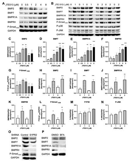 Low doses (1 to 2 μM) of JTE013, but not a S1PR2 shRNA, increased BMPs/Smad signaling in murine BMSCs cultured in osteogenic media. Murine BMSCs were cultured in osteogenic media with either DMSO or JTE013 for 9 days. Proteins were harvested 30 min after changing osteogenic media with or without JTE013. (A) BMP2, BMP7, BMPR1A, BMPRII, p-Smad1/5/9, and GAPDH protein levels in BMSCs treated with DMSO or JTE013 (0.5 to 8μM). (B) BMP2, BMP7, BMPR1A, BMPRII, p-Smad1/5/9, p-p38, p-JNK, and GAPDH protein levels in BMSCs treated with DMSO or JTE013 (1 or 2 μM). Protein densitometry of (C,H) BMP2, (D,I) BMP7, (E,J) BMPR1A, (F,K) BMPRII, (G,L) p-Smad1/5/9, (M) p-p38, and (N) p-JNK was normalized by GAPDH protein expression in BMSCs (n = 3, * p < 0.05, ** p < 0.01, *** p < 0.001). (O) BMP2, BMP7, BMPR1A, BMPRII, p-Smad1/5/9, and GAPDH protein levels in BMSCs treated with a control shRNA or a S1PR2 shRNA and cultured in osteogenic media for 9 days. (P) BMP2, BMP7, BMPR1A, BMPRII, and GAPDH protein levels in BMSCs treated with DMSO or brefeldin A (BFA, 0.75 μM) and cultured in osteogenic media for 6 days.