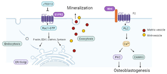 Schematic representation of the role of JTE013 in osteogenesis. Treatment with the S1PR2 antagonist, JTE013, increases Rac1-GTP, which promotes polymerization of actin to form F-actin and increases EEA1, clathrin, and syntaxin levels. These proteins, in turn, further stimulate both endocytosis and exocytosis. Exocytosis of Wnt vesicles excretes Wnt, which binds to the Fz receptor and activates PLC. Activation of PLC releases calcium, which serves as a second messenger to activate CaMKII and PKC. Activation of Wnt/Ca2+ signaling promotes osteoblastogenesis. Additionally, the exocytosis of matrix vesicles promotes mineralization.