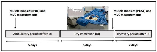 This study was conducted at the MEDES Space Clinic in Toulouse, France, from 19 November 2018 to 23 March 2019. Twenty healthy males were recruited, though two participants withdrew before the study began for unrelated reasons. Therefore, 18 participants were evenly and randomly divided into the control and cuff groups two days prior to the DI. All participants provided written informed consent for their participation in the study. The study followed the principles of the Declaration of Helsinki and was approved by the local ethics committee (CPP Est III: 2 October 2018 n° ID RCB 2018-A01470-55) and French Health Authorities (National Agency for the Safety of Medicines and Health Products on 13 August 2018). The study was also registered at ClinicalTrials.gov (NCT03915457). The participants had no history or physical signs of neuromuscular disorders, were non-smokers, and did not take drugs or medications. The participants arrived at the space centre in the evening five days prior to the start of DI and left the morning two days after DI was completed (Figure 1). Ambulatory baseline measurements were recorded for four days prior to DI, then the participants completed five days of DI followed by two days of ambulatory recovery. A pre-immersion control muscle biopsy was collected and the resting metabolic rate was measured. Participants in the cuff group wore thigh cuffs at 30–50 mmHg from 10 am to 6 pm on the first day of DI and from 8 am to 6 pm thereafter. Individual adjustments were made for each participant based on calf plethysmography measurements obtained with the participant in the supine position on the second day of DI. On the first day, thigh cuffs were placed immediately prior to the onset of immersion at 10 am. DI was conducted according to previously-described, strict methodology []. Two participants, one control and one cuff, underwent DI simultaneously in two separate baths in the same room. A thermoneutral water temperature was continuously maintained (33 ± 0.5 °C). The light-off period was set at 23:00–07:00. Daily hygiene, weighing, and specific measurements required extraction from the bath. During these out-of-bath periods, the subjects maintained the −6° head-down position. The total out-of-bath supine time during the 120-h immersion period was 9.7 ± 1.3 h, and the daily out-of-bath time was 1.1 ± 0.6 h. On the last day of DI, the out-of-bath time was 5.3 ± 1.1 h due to the muscle biopsy procedure and MRI exam. During DI, the participants remained immersed in a supine position for all activities and were continuously observed via video monitoring. Body weight, blood pressure, heart rate, and tympanic body temperature were measured daily. Water intake throughout the protocol was ad libitum, though maintained between 35–60 mL/kg/day and was measured. The menu was identical for all participants for each day of the study, and dietary intake was individually tailored and controlled.