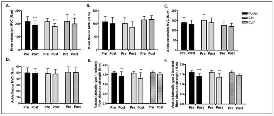Effects of 5 days of DI on muscle and fiber strength. Muscle maximal isometric voluntary contraction access by isocinetic dynamometer (N.m) expressed in both groups and pooled subjects. (A) Knee extension measurement. (B) Knee flexion measurement. (C) Ankle extension measurement. (D) Ankle flexion measurement. Isolated muscle fiber strength production by fiber type. (E). Type 1 isolated muscle fiber contraction. (F). Type 2 isolated muscle fiber contraction. *: different from pre value in the same group. * p < 0.05; ** p < 0.01; *** p < 0.001.