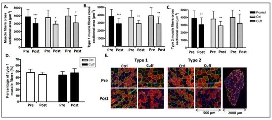 The CSA of muscle fibers decreased from 3778 µm2 to 2942 µm2 (−22.1%; p < 0.05) in the Ctrl group, from 3971 µm2 to 3113 µm2 (−21.6%; p < 0.05) in the Cuff group, and from 3867 µm2 to 3021 µm2 (−21.8%; p < 0.001) in the pooled group (Figure 3). The CSA of the slow muscle fibers decreased from 3724 µm2 to 2920 µm2 (−21.5%; p < 0.01) in the Ctrl group, from 3907 µm2 to 2881 µm2 (−26.2%; p < 0.01) in the Cuff group, and from 3808 µm2 to 2851 µm2 (−25.12%; p < 0.001) in the pooled group. The CSA of the fast muscle fibers decreased from 3800 µm2 to 2915 µm2 (−23.27%; p < 0.01) in the Ctrl group, from 4000 µm2 to 3237 µm2 (−19.07%; p < 0.05) in the Cuff group, and from 3892 µm2 to 3054 µm2 (−21.54%; p < 0.01) in the pooled group.