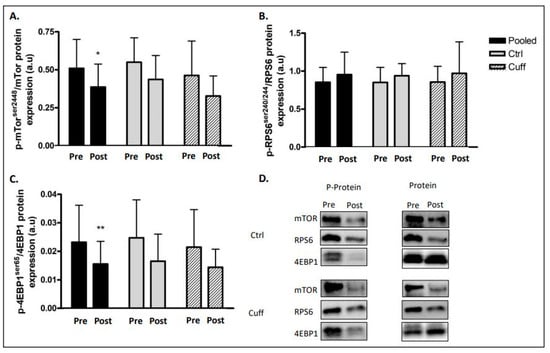 Effect of 5 days of DI on protein synthesis marker. Protein synthesis marker activation access by western blot analysis. (A) p-mTorser2448/mTor protein ratio. (B) p-RPS6ser240/244/RPS6 protein ratio. (C) p-4EBP1ser65/4EBP1 protein ratio. (D) Western blot picture analyzed by groups. * different from pre value in the same group. * p < 0.05; ** p < 0.01.