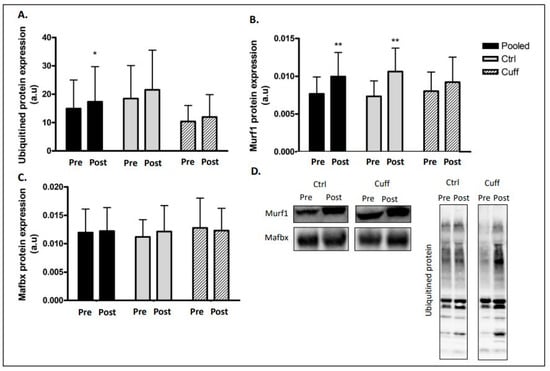 Effect of 5 days of DI on ubiquitin proteasome pathway. UPS marker activation access by western blot analysis. (A) Ubiquitinated protein profile expression. (B) E3 ligase Murf1 protein expression. (C) E3 ligase Mafbx (Atrogin1) protein expression. (D) Western blot picture analyzed by groups. * different from pre value in the same group. * p < 0.05; ** p < 0.01.