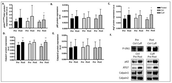 Effect of 5 days of DI on autophagic and calpain markers. Autophagy markers activation access by western blot analysis. (A) pUlk1ser757/Ulk1 protein ratio. (B) p62 protein expression. (C) ATG7 protein expression. (D) Calpain1 protein expression measurement. (E) Calpain2 protein expression measurement (F) Western blot picture analyzed by groups. * different from pre value in the same group. * p < 0.05; ** p < 0.01.