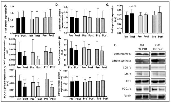 Effect of 5 days of DI on mitochondrial capacity. Mitochondrial content, activity, and biogenesis evaluated by western blot analysis. (A) FIS1 protein expression. (B) MFN2 protein expression. (C) PGC1-α protein expression. (D) Cytochrome C protein expression. (E) COXIV protein expression. (F) Citrate synthase protein expression. (G) Parkin protein expression. (H) Western blot picture analyzed by groups. * different from pre value in the same group. * p < 0.05; *** p < 0.001.