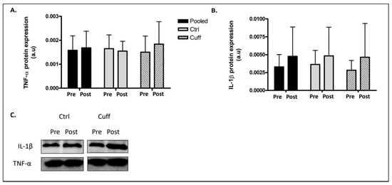 The protein levels of TNF-α and IL-1β were unchanged in the Ctrl and Cuff groups (Figure 8).