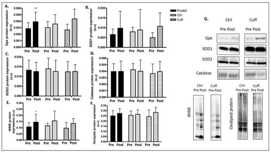 Oxidative stress variations were evaluated through the double aspect of damage in the cells and antioxidant cell defence adaptations. The 4HNE levels increased by 35.09% (p < 0.05) in the pooled group (Figure 9). In parallel, the carbonylated protein levels remained stable in the Ctrl and Cuff groups. For antioxidant cell defence adaptations, Gpx1 protein expression increased by 37.59% (p < 0.01) in the pooled group; however, the change in Gpx1 protein expression was not significant in the Ctrl or CT groups. SOD1, SOD2, and catalase protein levels were not significantly different in any group.