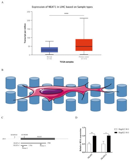 NEAT1 contributes to various biological processes and regulates diverse signaling pathways, especially in cancers. To determine the expression status of NEAT1 in liver cancer, we first assessed the expression of NEAT1 using the UALCAN database (http://ualcan.path.uab.edu/index.html, 26 September 2021). Compared with normal liver samples, the expression of NEAT1 in LIHC primary tissue was significantly upregulated (Figure 1A). To explore how substrate stiffness impacts liver cancer cell fate and the expression of NEAT1, we built a model of 3D topological micropillars. We established two different stiffnesses of substrates using PDMS, including stiff substrates (10:1) and soft substrates (30:1). HepG2 cells were then cultured on these micropillars (Figure 1B). Next, we examined the expression of NEAT1 in response to substrates by quantitative PCR (qPCR). Primer 1 identified total NEAT1 (NEAT1-1 and NEAT1-2), while primer 2 identified NEAT1-2 only (Figure 1C). Compared with the soft substrate (30:1), both the expression levels of NEAT1 and NEAT1-2 were enhanced in the stiff substrate (10:1) stimulated HepG2 cells (Figure 1D), showing that substrate stiffness increased the expression levels of NEAT1 and NEAT1-2. These results confirmed that NEAT1 was upregulated in liver cancer and functioned as a substrate stiffness-associated lncRNA in HepG2 cells.