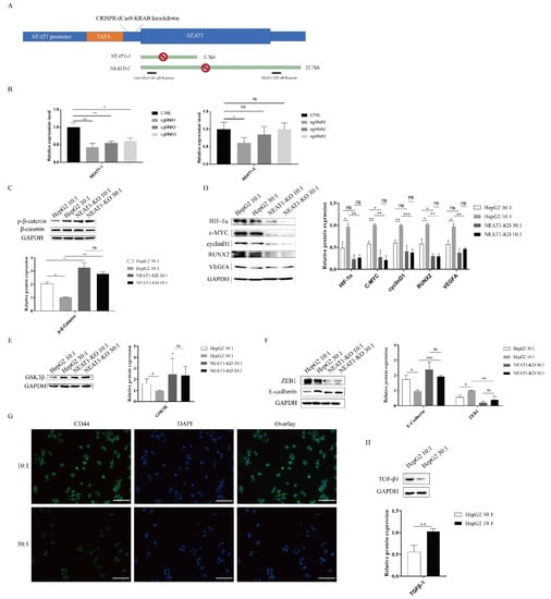 The lncRNA NEAT1 activates the WNT/β-catenin pathway in response to matrix stiffness stimuli. (A,B) Generation of HepG2 cell lines lacking expression of NEAT1 by CRISPR/dCas9-KRAB. (A) A schematic representation of the total NEAT1 knockdown strategy through CRISPR/dCas9-KRAB-mediated knockdown. A dCas9-KRAB guided by either NEAT1 promoter-targeting sgRNA was introduced to the region between the TATA box and the transcription start site (TSS) of NEAT1. (B) NEAT1 knockdown efficiency was detected by the two RT-qPCR primers (black bars). (C–E) Effect of substrate stiffness on the expression of β-catenin in HepG2-KD and HepG2 cells. (C) HepG2 cells were cultured in 3D micropillars (10:1, 30:1) for 24 h. Western blot analyzed the protein expressions of β-catenin and p- β-catenin. (D) Effects of substrate stiffness on the expression of the downstream protein of Wnt/β-Catenin in HepG2-KD and HepG2 cells. HepG2 cells were cultured in 3D micropillars (10:1, 30:1) for 24 h. Western blot analysis of protein expressions. (E) Effects of substrate stiffness on the expression of GSK3β in HepG2-KD and HepG2 cells. HepG2 cells were cultured in 3D micropillars (10:1, 30:1) for 24 h. Western blot analysis of protein expressions. (F) Effects of substrate stiffness on the protein expressions of EMT in HepG2-KD and HepG2 cells. HepG2 cells were cultured in 3D micropillars (10:1, 30:1) for 24 h. Western blot analyzed the expression of E-cadherin and ZEB1. (G) Effects of substrate stiffness on the expression of CD44. HepG2 cells were cultured in 3D micropillars (10:1, 30:1) for 72 h. IF analysis of CD44 expression. (Scale bar: 100 μm). (H) HepG2 cells were cultured on 3D micropillars (10:1, 30:1) for 24 h. Western blot analyzed the expression of TGF-β1. *, p < 0.05; **, p < 0.01; ***, p < 0.001; and ns, not significant.