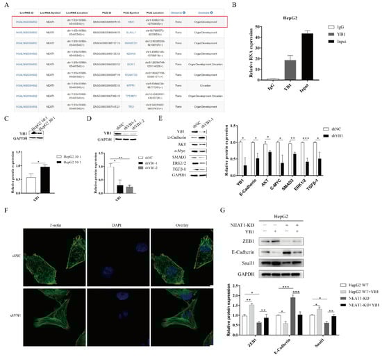 The lncRNA NEAT1 regulates the EMT process through YB1. (A) Analysis of the RNA binding proteins (RBPs) using an online database. We list relative score > 80% of RBP (YBX1). (B) The RNA immunoprecipitation experiment was performed using YB1 and IgG antibodies to probe HepG2 cell extracts, and the level of NEAT1 expression was determined using qPCR. (C) Effects of substrate stiffness on the expression of YB1 in HepG2 cells. HepG2 cells were cultured in 3D micropillars (10:1, 30:1) for 48 h. (D,E) The silencing efficiency of YB1 and downstream target in HepG2 cells were detected using WB. (F) HepG2 cells were treated after lentivirus transduction for 72 h. Phalloidin analysis of F-actin expression and localization by confocal microscope. (Scale bar: 5 μm). (G) Effects of YB1 on the expression of EMT-associated protein in HepG2-KD and HepG2 cells. Transfection of YB1 plasmid in HepG2-KD and HepG2 cells for 72 h. Western blot analyzed the protein expressions of E-Cadherin, ZEB1, and Snail1. *, p < 0.05; **, p < 0.01; and ***, p < 0.001.