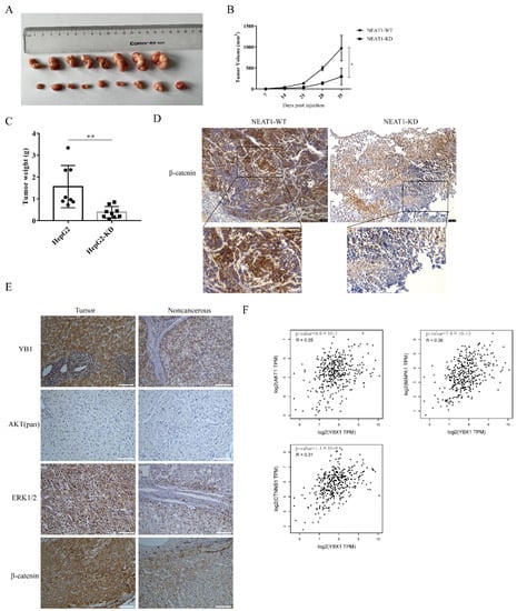 The lncRNA NEAT1 promotes the growth of liver cancer in vivo. NEAT1-KD HepG2 cells were inoculated into the subcutaneous tissue of nude mice. The tumor picture (A), the tumor volume (B), and tumor weight (C) are shown and compared among the groups; * is p < 0.05 and ** is p < 0.01. (D) Immunohistochemistry (IHC) staining of β-catenin in the tumors. The activation of the WNT/β-catenin pathway depends on the localization of β-catenin. The IHC staining of β-catenin overlay with the nuclear was displayed below. Scale bar: 75 μm. (E) IHC analysis to detect the expression of YB1, AKT, ERK, and β-catenin in liver cancer samples from patients. Scale bar: 100 μm. (F) The correlation between YB1 and AKT, ERK, and β-catenin in LIHC from the GEPIA database. The R values and p values are from Pearson’s correlation analysis.
