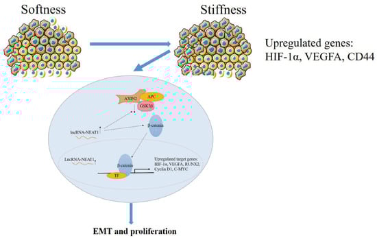 In general, higher substrate stiffness modulates the cell cycle and strengthens NEAT1 expression in HepG2 cells. Enhanced NEAT1 expression can activate the WNT/β-catenin signaling pathway, and then the WNT/β-catenin signaling pathway contributes to the EMT process and promotes tumor proliferation in liver cancer (Figure 7). This study elucidated the mechanisms of substrate stiffness-induced NEAT1 regulation of the EMT process through activating the WNT/β-catenin pathway in HepG2 cells, suggesting that the NEAT1-WNT/β-catenin pathway may potentially serve as a target for the clinical therapy of liver cancer.