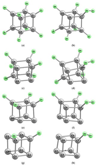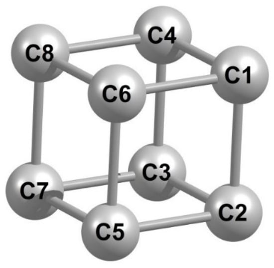 The choice of these six structures was determined by the next two factors: firstly, of the valence possibilities of the carbon atom (which can bind with one, two, three, or four neighboring atoms by means of three chemical bonds, according to the exchange mechanism of chemical bond formation); secondly, by these structures’ having the greatest typicality as compared with other structures of eight atoms. That is why, in particular, the hexagonal bipyramid, the dodecahedron and plane bicyclic structure containing articulated six-numbered and four-numbered rings, were not included in the number of initial structures because, here, as well as in other permissible eight-atomic structures, each carbon atom’s being bound to neighboring carbon atoms by exactly four chemical bonds is impossible to achieve. The correspondence of the found stationary points to energy minima was proved, in all cases, by calculating the second derivatives of the energies with respect to atoms’ coordinates; all equilibrium structures corresponding to the minima on the potential energy surfaces have only positive frequencies.