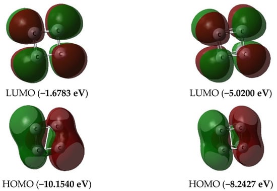 The images of the highest occupied (HOMO) and lowest vacant (LUMO) molecular orbitals obtained using the above quantum chemical methods are presented in Figure 2. As can be seen therein, the forms of the given MOs obtained by these different methods are very similar to each other, wherein, however, the energies of these MOs are very different from each other. Most likely this difference is associated with a well-known feature of the DFT methods, and namely—due to some approximations that simplify the calculation of the electron correlation—the underestimation, in particular, of the difference in the HOMO-LUMO energies. That is why the data of the coupled-cluster method (CCSD), in the given case, should be considered much more reliable.