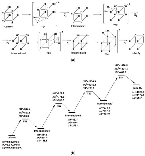 As can be seen from the data presented in Figure 3b and Table 3, each of the four successive stages of the cubane dehydrogenation reaction is characterized by high values of activation enthalpies and, at the same time, rather low values of activation entropies, as a result of which the energy barriers for the formation of transient states are very significant, wherein the realization of each of these stages is due to the entropy factor, so that all of them can be realized only at sufficiently high temperatures (more than 2000 K). However, even at such high temperatures, the rates of these reactions are likely to be insufficient for their practical implementation within a sufficiently short time, and if so, then in order to increase them, it will be necessary to search for appropriate catalysts for these very reactions.