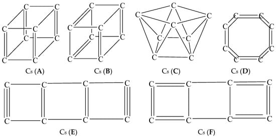 Potential molecular structures of octa-carbon: C8 (A) and C8 (B)—cubes, C8 (C)—square antiprism, C8 (D)—octagon, C8 (E) and C8 (F)—a combination of three rectangles with four common vertices.