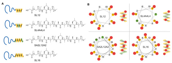 Schematic illustrations of chemical structures (A) and helical wheels (B) of amphiphilic polypeptides; SL12, SL4A4L4, SA2L12A2, and SL16. Yellow, green, and gray dots of helical wheels reflect the position of Leu, Ala, and Aib, respectively. Red dots indicate the positions of Leu side chains on the helix (B).