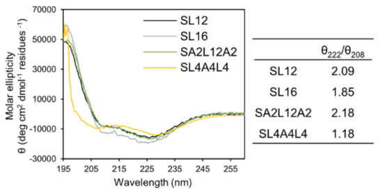 The polysarcosine chain length 27, 24, 26, and 28 mers of the synthesized amphiphiles SL12, SL4A4L4, SA2L12A2, and SL16 were determined by MALDI-TOF MS and 1H NMR spectroscopy, respectively (Figures S1–S4). These hydrophilic chain lengths can be treated as the same. The length of 20–30 mers was chosen according to previous work [21,25,27]. Next, the secondary structure of the hydrophobic block of the amphiphiles was investigated by CD spectroscopy. All hydrophobic blocks of the peptides in the assemblies formed an α-helix structure and their helix contents per residue were not significantly different in milli-Q water (Figure 2). The ratios of θ222/θ208 for all samples were higher than 1, indicating that helices were densely packed to form a bundle in a hydrophobic layer of peptide assembly [28,29,30,31].