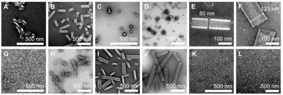 To study the effect of temperature on DLPANT formation, a mixture of SL12 nanotubes and SA2L12A2 solution was heated at 50 and 70 °C for 6 h. In both cases, DLPANT was not obtained (Figure S6). This could be because the polysarcosine layers of the SA2L12A2 sheet and SL12 nanotube were dehydrated at 90 °C, and the SA2L12A2 sheet spontaneously wrapped the surface of the SL12 nanotube due to an enhanced hydrophobic–hydrophobic interaction. To further promote hydrophobic interaction among the assemblies to improve the yield of DLPANT formation, we added PEG solution to the SL12 nanotube dispersion (final concentration of PEG 30%), then injected SA2L12A2 ethanol solution into the mixture, followed by heat treatment at 90 °C for 3 h. PEG is known as a dehydration agent and has been reported to promote hydrophobic interaction and sticking between assemblies due to the dehydration of hydrophilic surfaces [38,39]. As a result, DLPANT, as the major fraction, as well as a multi-layer peptide amphiphile nanotube (MLPANT), were obtained with a higher yield of >95% (Figure 5E and Figure S7). After removal of the PEG via dialysis, DLPANT and MLPANT remained (Figure 5F).
