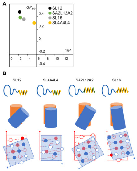 The membrane fluidity of each peptide assembly was investigated using fluidity-sensitive dyes, DPH and Laurdan, which can insert into the hydrophobic region and hydrophilic–hydrophobic interface of the amphiphile membrane, respectively [35,36,37]. We can estimate the helix packing from the membrane fluidity because the membrane fluidity directly reflects the rigidness of the molecular packing. The hydrophobic layer of SL12 and SA2L12A2 showed similar 1/P values of 2.23 and 2.37, respectively, but the hydrophilic–hydrophobic interface had a different fluidity, showing GP340 values of 0.474 and 0.384, respectively (Figure 4A). This result also supported our hypothesis that SA2L12A2 formed a similar helix–helix interaction in the LxLxLxLxLxLx region to that of SL12, but the hydrophilic–hydrophobic interface composed of Ala-Aib residues was slightly more fluid than that composed of Leu-Aib in the SL12 nanotube. In contrast, SL16 showed a higher 1/P value of 3.19 and lower GP340 value of 0.357 than SL12, which indicates a relatively fluid hydrophobic layer and interface compared with those of L12 (Figure 4A). This result also means that the SL16 assembly was formed by a different helix packing to the tube-forming packing derived from the LxLxLxLxLxLx sequence (Figure 4B). Finally, SL4A4L4 had significantly different 1/P and GP340 values of 5.45 and 0.299, respectively. Therefore, the membrane composed of SL4A4L4 might be fluid owing to the lack of a stable concave–convex interaction induced by the side chain of Leu in the middle of the helix.