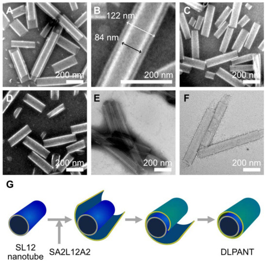 Negatively stained TEM images of assemblies prepared by SA2L12A2 self-assembling in a SL12 nanotube dispersion (A,B), SL12 self-assembling in a SA2L12A2 nanotube dispersion (C), and the self-assembly of a mixture of SL12 and SA2L12A2 (D). (B) is the magnification of (A). TEM observation of SA2L12A2 self-assembled on the surface SL12 nanotubes with 30% PEG (E) and subsequent purification to remove PEG through dialysis (F). Schematic illustration of the formation mechanism of DLPANT (G). Scale bars are 200 nm.