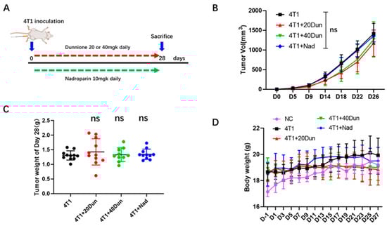 The 4T1 cell lines were cultured in the RPMI 1640 medium (11875-093; Gibco, UK) supplemented with 10% v/v fetal bovine serum (S001-07; Welgene) and 1× antibiotic antimycotic containing streptomycin and penicillin (15240-062; Gibco, USA) at 37 °C in a humidified atmosphere of 5% carbon dioxide (CO2). Cells were inoculated into mice after fewer than five serial passages in culture. Dunnione was chemically synthesized by Erum Biotechnologies (Suwon, Korea) and sonicated as particles using an ultrasonic cleaner (Power Sonic 510; Daejeon, Korea). Nadroparin calcium was purchased from Kingfriend (Nanjing, China).