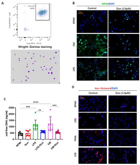 To investigate how tumors promote NET generation and the effect of dunnione on NETosis, isolated bone marrow neutrophils with a viability > 98% and purity > 90% (Figure 5A) were treated with 4T1 conditioned medium (CM) or LPS with or without dunnione. Consequently, we found that neutrophils formed abundant NETs when cultured in CM or stimulated with LPS, manifested as co-localization of extracellular DNA (blue) with MPO (green) by IF staining, which is considered to be a marker of NETosis (Figure 5B). However, NETosis induced by CM or LPS was obviously inhibited by dunnione, characterized by normal neutrophil morphology with multi-lobulated nuclei, similar to neutrophils cultured in the Roswell Park Memorial Institute (RPMI) (control) medium (Figure 5B). Measurement of extracellular DNA (pico green-stainable DNA) in the supernatant of cell culture also confirmed the effect of dunnione on the inhibition of NETosis. Incubating neutrophils with LPS or CM for 3 h demonstrated a marked increase in Pico Green stained DNA, but was significantly decreased when co-incubated with dunnione (Figure 5C).