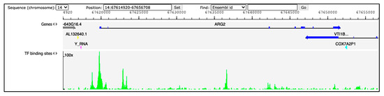 Peaks of TF binding sites from GTRD (http://gtrd.biouml.org, v20.06, accessed on 31 August 2021). The tracks in the diagram indicate genes and TF binding sites. Dark-blue segments in the ARG2 gene correspond to the exons. The green histograms refer to DNA footprint peaks corresponding to the TF binding sites in the region chr14:67,614,920–67,656,708.