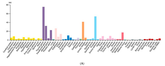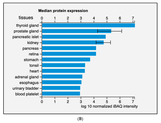 Expression of ARG2 in human tissues. (A) Histogram of the Consensus Normalized eXpression (NX) of ARG2 transcript in human tissues as reported in the Human Protein Atlas v20.1 (https://www.proteinatlas.org/ENSG00000081181-ARG2/tissue; accessed on 31 August 2021). Color-coding is based on tissue groups, each consisting of tissues with functional features in common. (B) Histogram of ARG2 protein expression as reported in Proteomics DB v3.0 (https://www.proteomicsdb.org/; accessed on 31 August 2021) [16,17]. Organ and tissues with the higher protein expression are thyroid and prostate glands, pancreatic islets, kidney, and pancreas. iBAQ: intensity Based Absolute Quantification.