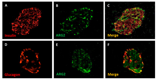 Immunofluorescence detection of insulin (A), glucagon (D) and ARG2 (B,E) in human pancreatic islet cells. The enzyme is localized in insulin-containing beta cells (C) and, to a lower extent, in glucagon-contaning alpha cells (F). Magnification 40×. Adapted from Solimena et al., 2018 [18].