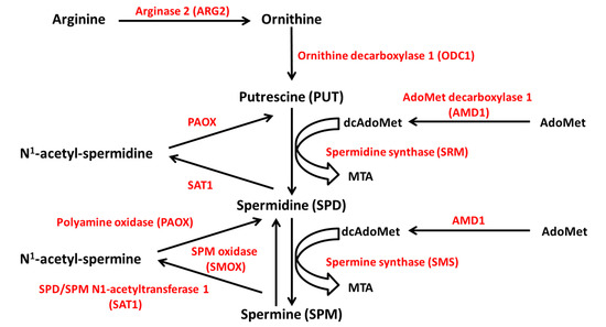 - Pegg, A.E. Mammalian polyamine metabolism and function. IUBMB Life 2009, 61, 880–894. [Google Scholar] [CrossRef]
