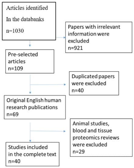 This review summarizes data from numerous studies of the urine proteome in nephropathies associated with CKD, with a focus on recent studies from 2015 to 2021. The electronic databases MEDLINE, PubMed, and Cochrane were searched using keywords such as “proteomics”, “peptidomics”, “biomarkers”, “chronic kidney disease”, “urine”, “membranous nephropathy” “IgA nephropathy”, “focal segmental glomerulosclerosis” “minimal-change disease”, “diabetic nephropathy”, and “lupus nephritis”. The reference lists of articles were also investigated to explore related literature. The bibliographic information of 1030 retrieved articles was analyzed, and papers with irrelevant or unreliable information, those unavailable in full text, and those not in English were deleted. After deleting all duplicate references, 69 articles remained. A flow chart is outlined in Figure 1.