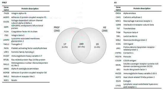 Protein samples coming from the two conditions (PRGF and AS) and obtained from the three donors were analyzed independently for differential protein expression. About 285 different proteins were detected in total between both types of formulations. For the complete list of proteins in these formulations and their relative expression see Supplementary File S1. The Venn diagram in Figure 1 summarizes the intersection of the total proteins in both blood-derived products (PRGF and AS). In summary, the number of proteins identified in each formulation was 266 and 268, respectively. The Venn diagram shows that 249 proteins (87.4% of all proteins) were shared by both formulations, while 17 proteins (6.0% of the total) were only identified in the PRGF formulation, and 19 (6.6%) were specific to the AS product. The lists of proteins shared or specific to each formulation are included in Supplementary File S1.