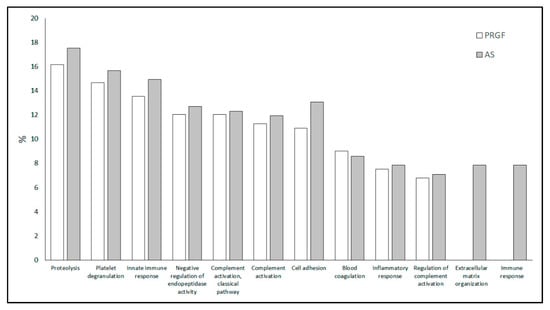 A GO analysis was carried out with the aim of characterizing the functional processes these proteins are involved in. A total of 259 different GO terms were found between the two blood-derived products (PRGF and AS). The lists of all GO terms corresponding to each formulation can be found in Supplementary File S1. Figure 2 shows the twelve most abundant GO terms found between the two formulations (PRGF and AS). The first ten GO terms shared by all formulations may be grouped into 3 main processes: (i) Cellular activity, consisting on proteolysis, negative regulation of endopeptidase activity and cell adhesion GO terms; (ii) Immune response combining the GO terms of innate immune response, complement activation (classical pathway), complement activation, inflammatory response and regulation of complement activation; and (iii) Platelet function, which comprises the GO terms of platelet degranulation and blood coagulation. Although the percentage of differentially expressed proteins involved in all these GOs are similar for every blood-derived product, there are at least two processes for each, such as extracellular matrix organization and immune response, meaning that some proteins were found in AS but not in PRGF.