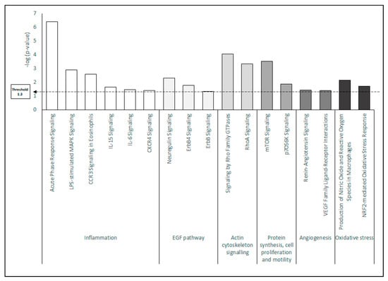 Canonical pathway analysis of the differentially expressed proteins in HK cells after treatment with PRGF or AS. The most significantly enriched canonical pathways (−log p values in the y axis) are displayed. The results are clustered in functionally related groups of processes: Inflammation; EGF pathway; Actin cytoskeleton signaling; Protein synthesis, cell proliferation and motility; Angiogenesis; and Oxidative stress.