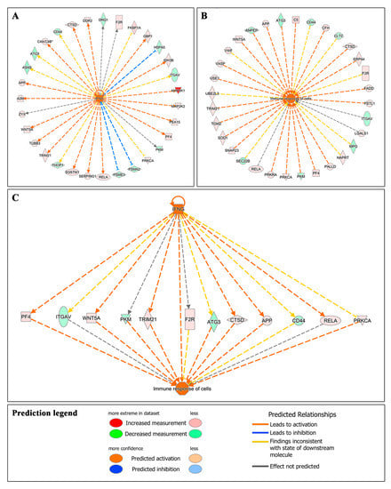 IPA analysis of differentially expressed proteins related to an immune response. (A) the IPA upstream regulators analysis suggests that several proteins differentially expressed with AS treatment are related to the activation of HK by IFN-γ. (B) IPA downstream analysis also showed that numerous differentially expressed proteins are associated with an immune response of HK cells treated with undiluted AS. (C) Finally, IPA upstream/downstream analysis link some differentially expressed proteins with the activation of HK cells by IFN-γ and the induction of an immune response.