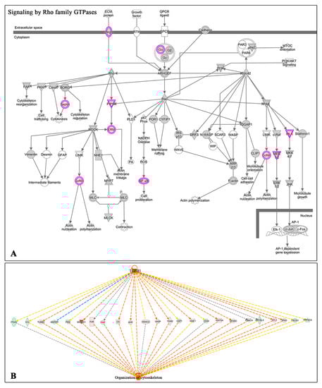 IPA analysis of differentially expressed proteins related to actin cytoskeleton activation. (A) Signaling cascade of Rho Family GTPases pathway. Red circles represent over-expression of proteins in HK ells treated with undiluted AS. (B) IPA upstream/downstream analysis link some differentially expressed proteins with the activation of HK cells by TGF-β1 and the activation of the cytoskeleton organization.