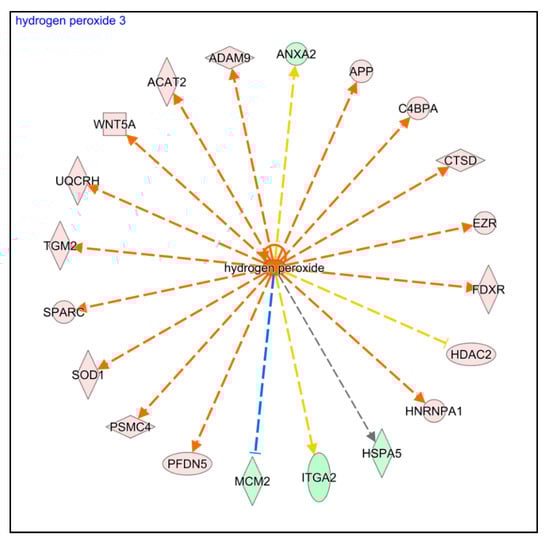 Finally, two more regulatory pathways related to oxidative stress (Production of Nitric Oxide and Reactive Oxygen Species in Macrophages and NRF2-mediated Oxidative Stress Response) were also significantly activated in AS compared to PRGF (Figure 3 and Supplementary Figure S4). In addition, the IPA upstream analysis revealed that some differentially expressed proteins were related to the activation of HK cells by oxidative stress, similar to the induction of HK cells by the addition of hydrogen peroxide (Figure 6). These results suggest that oxidative stress is significantly increased in HK cells after AS treatment in comparison to PRGF.